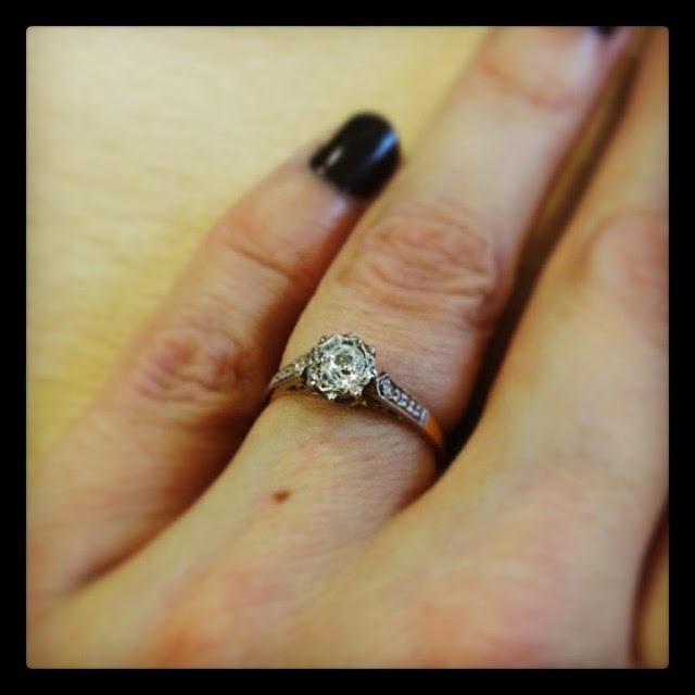 So what to do? I knew I wanted a diamond. I knew I wanted it to be discreet but sparkly and I knew I didn't have much money. After steaming up the window looking at perfect and perfectly unaffordable antique rings in the local antique jewellery shop, I headed to Ebay. There is the danger with Ebay that you may be buying a dud but that's where some research comes in. Look at what else the seller has on offer, check their feedback, look closely at the pictures. I spent about a week looking at various rings before selecting my favourite three. Then I asked Ray which he would pick for me. Proving he knows me well, he picked the same one that I had fallen in love with. Small but shiny and, importantly for me, reminding me of my gran's engagement ring, I broke with my Ebay rules and set up a snipe bid for it.